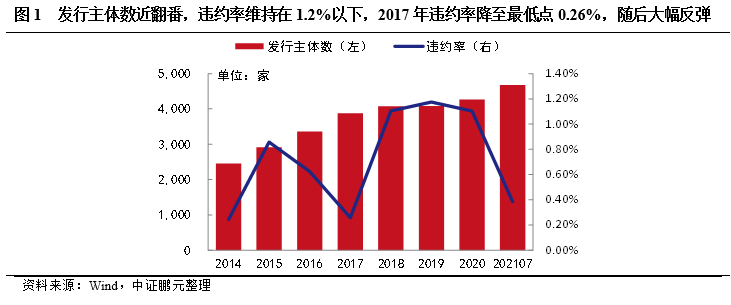 2014-2021年(2021年數據截至7月底,下同),我國信用債券違約主體數不斷增長,2019年為違約高峰,首次違約的主體數達到48家(表1)。隨著違約主體數增加,違約率也有所上升,但由于我國信用債券市場擴容、發債主體數大幅增長(圖1),違約率增長速度低于違約主體數的增長速度,近三年基本維持在1.1%上下。在2017年時,違約數量大幅下降,違約率下降至2014年后的歷史低點0.26%(表1和圖1),隨后違約數量大幅增加,違約率開始反彈,并創新高隨后維持較高水平。2021年由于時間跨度只有7個月,違約數量較少,導致違約率較低。
