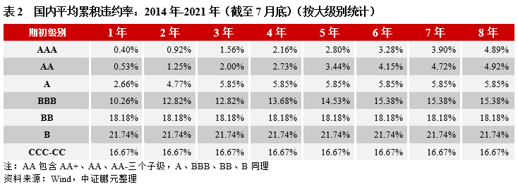 依照上述處理方法,我們按大級別和小級別兩類分別統計了2014-2021年的平均累積違約率,大級別違約率用于觀察違約率從高級別到低級別的整體分布概況,小級別違約率用于觀察子級別間的違約率差異。并對比穆迪全球的平均累積違約率數據,從而觀察出我國的違約率特征(注:我國數據和穆迪全球數據的統計年度不完全重疊,兩者經歷的經濟周期不同,會對違約率產生一定的影響,本文假設這種影響較小,暫且忽略該因素對最終違約率的影響)。