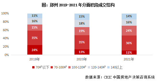 通讀新政全文還可以發(fā)現(xiàn),支持改善性需求有效釋放貫穿文件始終,新政為何要重點(diǎn)著墨改善性需求?原因在于鄭州新房的成交結(jié)構(gòu)中,剛需占主導(dǎo)地位,這也意味著改善性購(gòu)房需求未來(lái)仍有較大釋放空間。2021年,鄭州100平方米以下新房成交套數(shù)占比接近50%,120平方米以下新房成交占比達(dá)到70%,而140-180平方米、180平方米以上改善、終改成交占比僅為11%和3%。