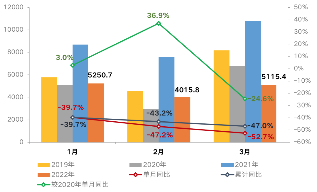 圖:2022年1-3月百強(qiáng)房企單月業(yè)績表現(xiàn)及同比變動(dòng)(億元)