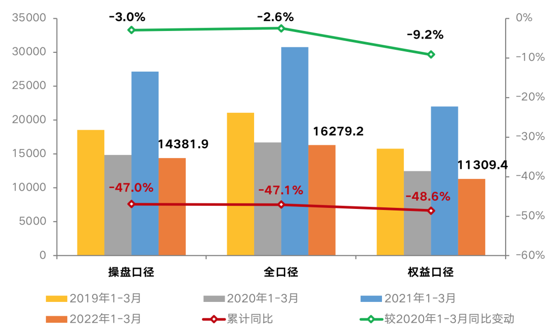 CRIC數(shù)據(jù)顯示,一季度,百強(qiáng)房企操盤金額為14381.9億元,同比大降47%,全口徑銷售金額為16279.2億元,同比降幅也達(dá)到了47.1%,業(yè)績表現(xiàn)不及2020年的同期水平。