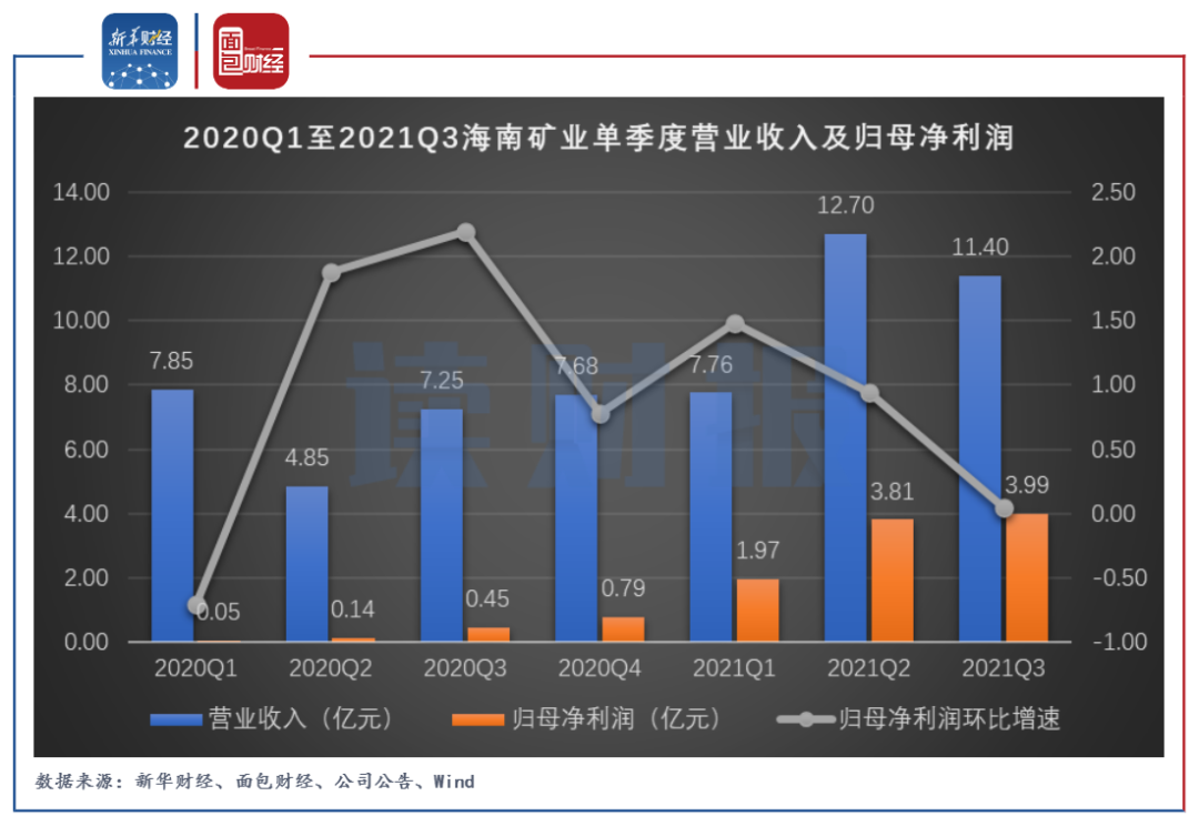 圖3:2020Q1至2021Q3海南礦業(yè)單季度營(yíng)業(yè)收入及歸母凈利潤(rùn)