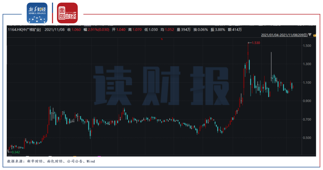 海南礦業(yè)早在2016年11月與中廣核礦業(yè)簽署認(rèn)購(gòu)協(xié)議,通過(guò)全資子公司香港鑫茂投資認(rèn)購(gòu)中廣核礦業(yè)增發(fā)的6.59億股股票,每股價(jià)格0.52港元。中廣核礦業(yè)的母公司為中國(guó)廣東核電集團(tuán),主要業(yè)務(wù)為天然鈾貿(mào)易、物業(yè)投資及其他投資。2021年年初至今,中廣核礦業(yè)股價(jià)大幅上漲,截至11月8日收盤(pán),中廣核礦業(yè)股價(jià)收?qǐng)?bào)1.06港元/股,期間累計(jì)漲幅近200%。