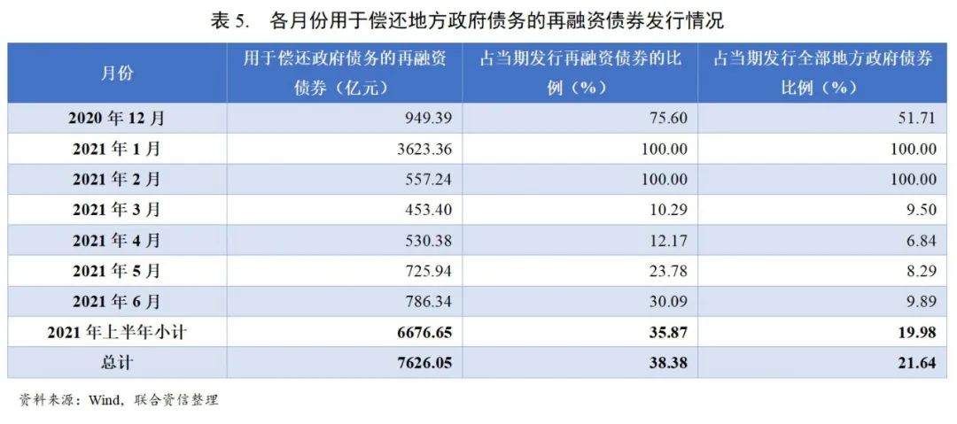 2020年12月及2021年上半年,用于償還政府債務(wù)的一般債券和專項債券分別為4177.93億元和3448.12億元,分別占同期發(fā)行再融資債券的比例為34.41%和44.63%,分別占同期發(fā)行全部地方政府債券的比例為24.82%和18.72%。化債用途專項債券在再融資債券中的占比相對較高,或由于地方政府隱性債務(wù)的認定通常需要保證債務(wù)與公益性項目資產(chǎn)相對應(yīng),因此用于項目投資的專項債券或更適合對非債券形式的債務(wù)進行置換。