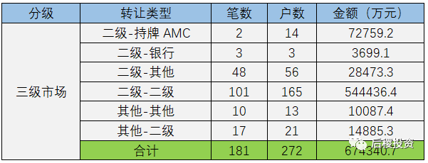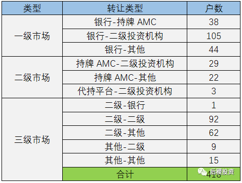 按慣例,我們將行業市場分為三級:銀行出讓債權為一級市場;本地持牌AMC或代持機構在當地出讓債權為二級市場,其余的債權轉讓為三級市場。