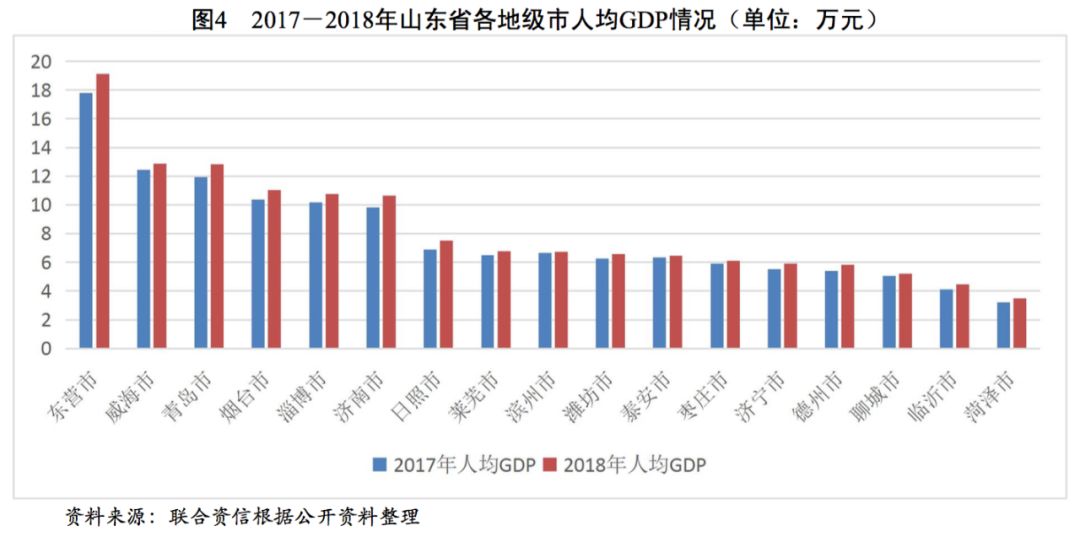 從山東省地級市GDP方面看,青島市的GDP規模和增速處于領先地位,2017-2018年,青島市GDP分別為11037.28億元和12001.50億元,GDP增速分別為7.5%和7.4%,2018年青島市GDP占全省的比重為15.69%。濟南市和煙臺市的GDP規模僅次于青島市,2018年,上述兩個地級市的GDP規模分別為7856.56億元和7232.58億元;濰坊市和淄博市的GDP規模均超過5000億元;GDP規模在5000~3000億元的地級市有濟寧市、臨沂市、東營市、泰安市、威海市、德州市、聊城市和菏澤市;日照市、濱州市、棗莊市和萊蕪市經濟實力較弱,GDP均不到3000億元。總體看,山東省各地級市經濟分化程度較高,青島市的GDP規模及增速處于絕對領先地位,濟南市、煙臺市、濰坊市和淄博市經濟體量其次,濱州市、棗莊市、日照市和萊蕪市經濟體量小。從人均GDP來看,2017年和2018年東營市、青島市和威海市的人均GDP處于省內最高,而聊城市、臨沂市和菏澤市規模最小,人均GDP差異主要為地方經濟實力及人口規模等因素所致。