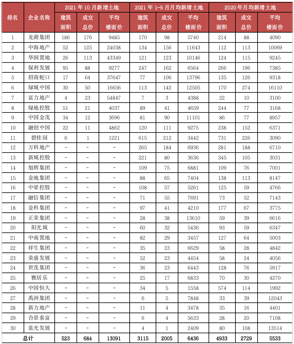 表:2021年10月30家監(jiān)測企業(yè)新增土地統(tǒng)計(jì)表(單位:萬平方米、億元、元/平方米)