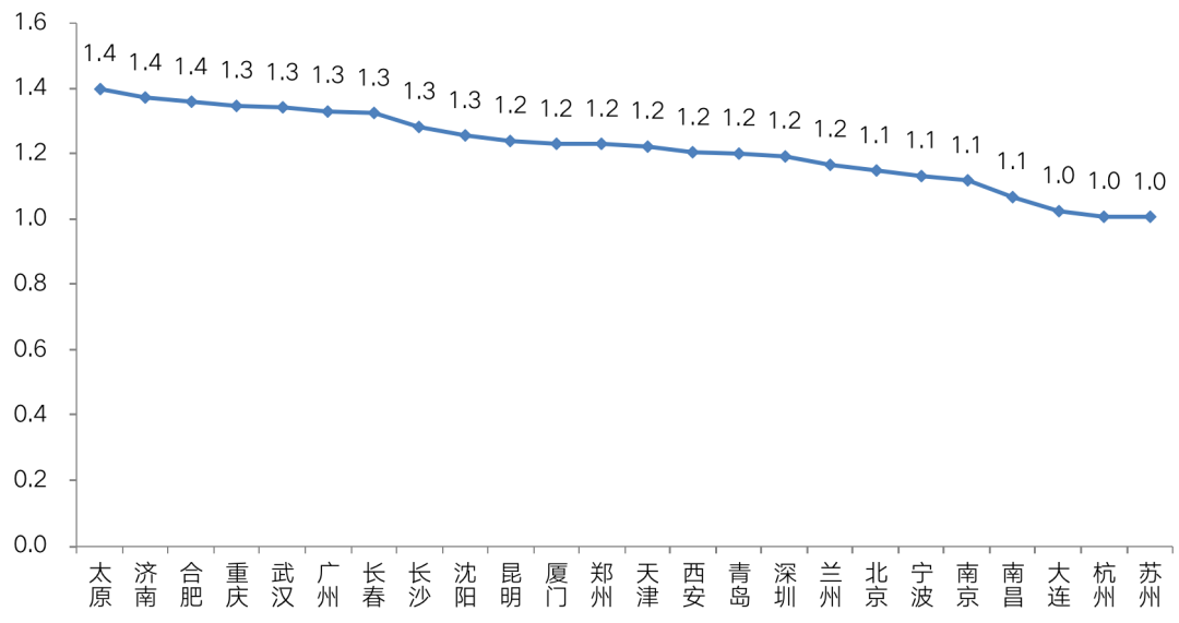 相比之下,杭州、寧波、南昌等供求比較均衡(供求比均在1.1及以下)的城市,流拍率則處于相對(duì)較低水平,溢價(jià)率也處于相對(duì)高位。典型如杭州,2020年涉宅土地流拍率(按幅數(shù))僅有2%,而溢價(jià)率卻高達(dá)21%,土地市場(chǎng)熱度明顯高于供求比較高的城市。