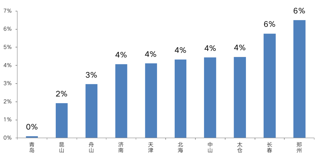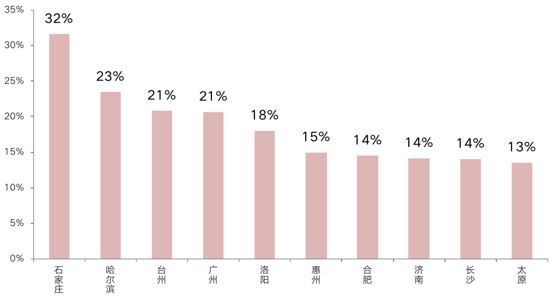 分城市來看,24個(gè)重點(diǎn)一二線城市中供求比超1.3的城市達(dá)到了三成,其中太原、濟(jì)南、合肥等城市表現(xiàn)尤為突出,供求比均超1.35,土地流拍占比相對(duì)較高。CRIC監(jiān)測(cè)的重點(diǎn)城市流拍數(shù)據(jù)(按幅數(shù))顯示,三城均是流拍率TOP10城市,流拍率都超過了12%,均是流拍的“重災(zāi)區(qū)”。即便是成交地塊,溢價(jià)率水平也相對(duì)較低,以今年商品房市場(chǎng)表現(xiàn)欠佳的濟(jì)南為例,涉宅土地溢價(jià)率僅有4%,多宗土地為底價(jià)成交,土地市場(chǎng)非常蕭條。
