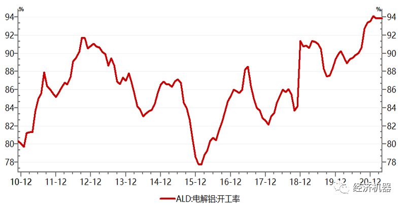過去數年,去產能成為供給側結構性改革的重心和抓手。工業主管部門確定了在鋼鐵、煤炭、水泥、電解鋁、玻璃等幾大產能過剩重點行業,以壯士斷腕的勇氣,給出每年壓縮產能的具體任務和指標。經過數年努力,我國鋼鐵行業壓縮產能累計達到1.5億噸,煤炭行業退出落后產能超過10億噸,電解鋁落后產能淘汰近500萬噸,超額完成“十三五”任務,絕大部分產能過剩行業“過剩”狀況得到實質性改善,部分大宗商品供過于求的狀況得到根本緩解,基本處于供求平衡的狀態,如煤炭行業產能利用率接近100%(圖1),電解鋁行業產能利用率從2016年1月份最低時77.8%,上升到當前的94%(圖2)。疫情前去產能工作取得了實質性的勝利,歷史任務已經基本完成。