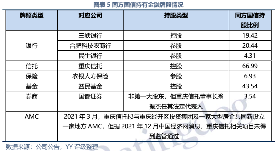 同方國信曾被人稱為重慶金融的“半壁江山”,其以重慶信托為支點(diǎn),控股和參股多家金融機(jī)構(gòu),以三峽銀行為核心,一手把握信托、銀行、保險(xiǎn)(參股)、基金、券商(參股)等牌照。