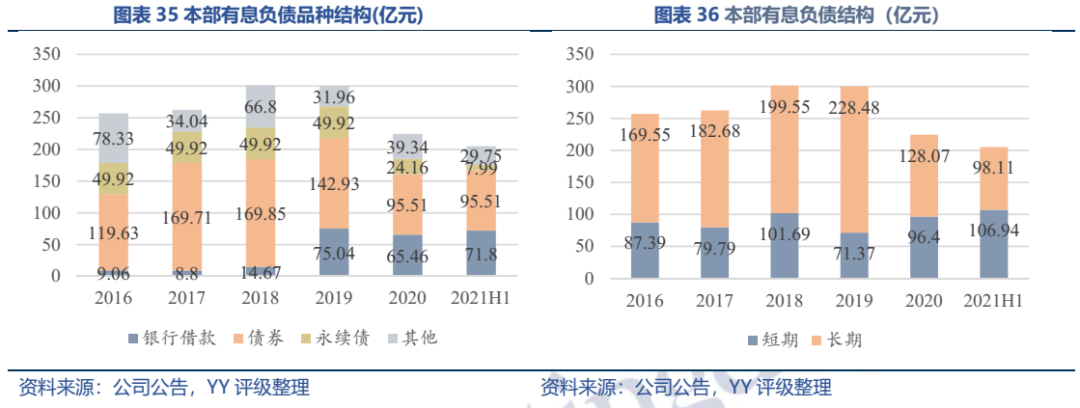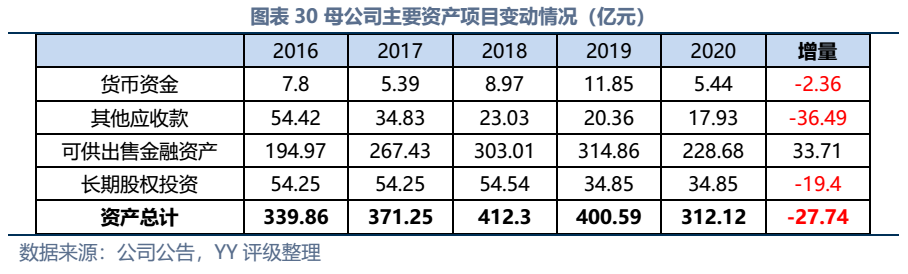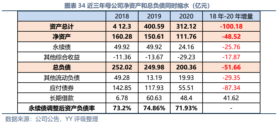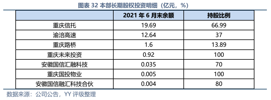 因同方國信子公司獨(dú)立性較強(qiáng),我們主要梳理了本部的資產(chǎn)以及測算了債務(wù)壓力和短償債能力。資產(chǎn)方面,以信托投資(交易性金融資產(chǎn)103億元主要為信托投資)、民生銀行股票(最新市值約73億元,已質(zhì)押,2019年來市值縮水37%)、重慶信托67%股權(quán)(賬面以成本法計(jì)量僅20億元,但按重慶信托最新凈資產(chǎn)計(jì)量則價(jià)值282億元)為主;債務(wù)方面,19年以來,本部有息債務(wù)水平有所降低(主要通過可供出售金融資產(chǎn)變現(xiàn)償還),截至21年中,有息債務(wù)205億元,短債107億元,22年將有64億元債券到期或行權(quán),短債壓力較大。測算短期可變現(xiàn)資源,預(yù)計(jì)短期內(nèi)變現(xiàn)能力比較確定的僅約22億元,要覆蓋22年內(nèi)到期或行權(quán)的64億元債券還有較大缺口,可能需要關(guān)注信托投資資產(chǎn)或者牌照的價(jià)值(比較難及,且由于重慶信托股權(quán)不可質(zhì)押,且前文所描述,重慶信托的真實(shí)控制權(quán)在新渝富的持股鏈條上,同方國信更多是居于財(cái)務(wù)投資這一角色,可能如果臨時(shí)出現(xiàn)兌付危機(jī),假設(shè)重慶信托的資產(chǎn)質(zhì)量仍有支持,股權(quán)仍有較高價(jià)值)。