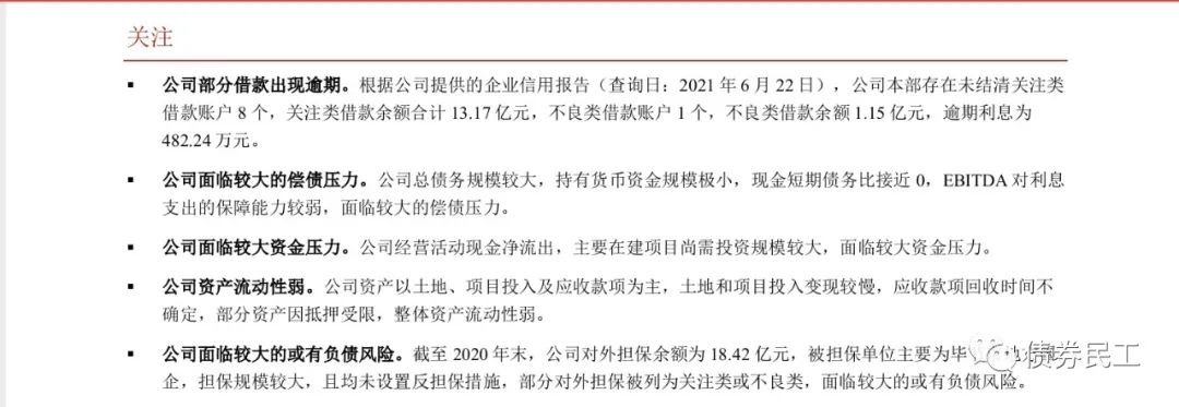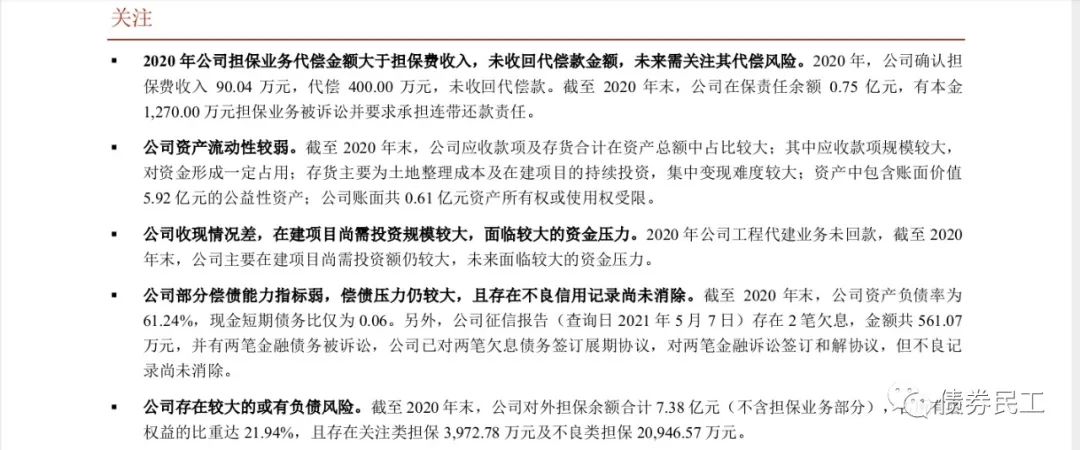 3、遵義市播州區(qū)城市建設(shè)投資經(jīng)營(集團(tuán))有限公司(以下簡稱“播州建投”)。根據(jù)中誠信國際2021年6月29日出具的跟蹤評級報告,播州建投存在多筆關(guān)注類、不良貸款、欠息、被追償?shù)炔涣加涗?,且已?jīng)被納入失信被執(zhí)行人名單。播州建投的控股股東為遵義道橋建設(shè)(集團(tuán))有限公司,播州建投最新主體評級為AA-,評級展望為負(fù)面,目前存續(xù)債券2只,分別為“17遵義播投債01”(企業(yè)債券,債券余額為6.4億元)、“PR播投02”(企業(yè)債券,債券余額為5.6億元)。