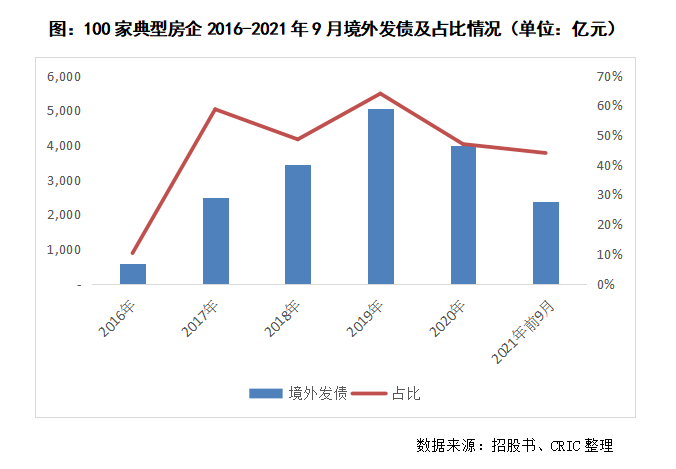 自2017年房企廣泛發(fā)行境外美元債以來,境外發(fā)債逐步成為房企融資方式里面的重要組成部分,融資量逐年上漲,到2019年100家房企境外發(fā)債達(dá)到高峰,融資量約達(dá)到5052億元,占所有發(fā)債總量的64%。但值得注意的是,2020年疊加疫情全球擴(kuò)散美元債市場動(dòng)蕩,以及三條紅線出臺(tái)等多重原因,境外發(fā)債方面有所收縮,融資量約為3998億元,同比下降21%,其在企業(yè)發(fā)債的占比也同比下降了17個(gè)百分點(diǎn)至47%。2021年前9月,房企境外發(fā)債2379億元,同比下降24%,占比也同比下降了2個(gè)百分點(diǎn)至44%,境外債券發(fā)行進(jìn)一步收緊。