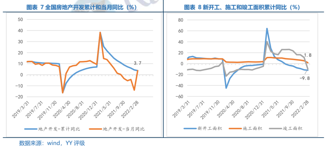 22年1-2月全國房地產(chǎn)開發(fā)投資累計(jì)同比上升3.7%,較21年1-12月下降0.7pct,當(dāng)月同比上升3.67%,較21年12月增加17.58pct。我們認(rèn)為在土地購置費(fèi)占比減少的當(dāng)前開發(fā)構(gòu)成中,可能更多依賴原材料上漲拉升施工增長。結(jié)合新開工、施工和竣工面積累計(jì)同比仍在下滑,分別較21年1-12月下降0.8pct、3.4pct和21.0pct,故成本端的上漲而非真實(shí)投資面積的增長使得開發(fā)投資繼續(xù)超預(yù)期的可持續(xù)性較弱。