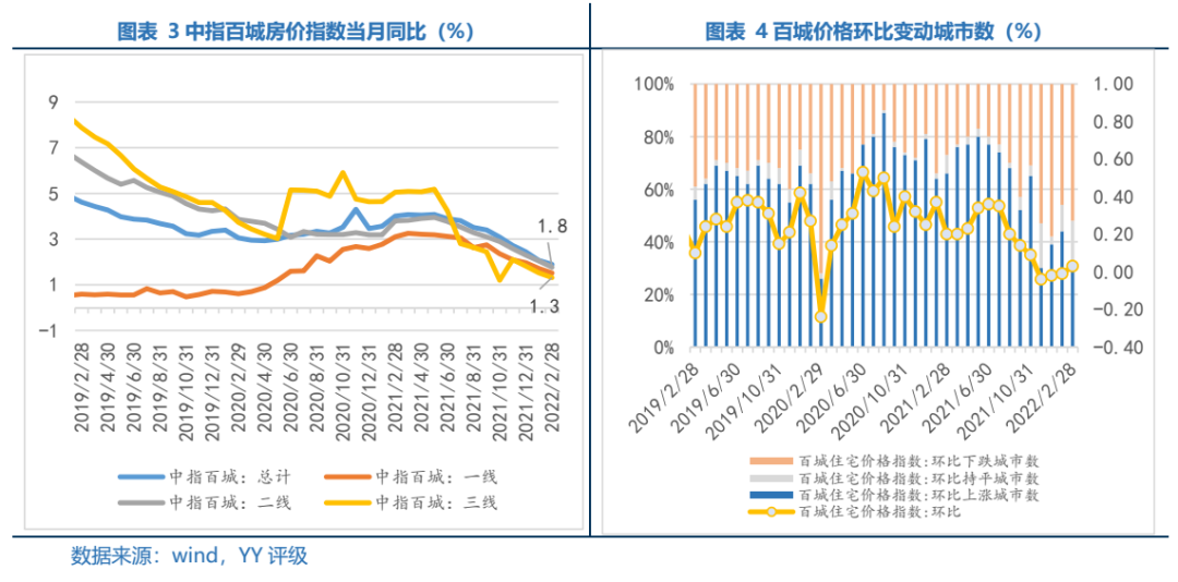 從成交價(jià)格看,隨著調(diào)控加碼和房企流動(dòng)性問題的逐漸暴露,一二三線城市房價(jià)指數(shù)增長速度在21年中達(dá)到階段性高點(diǎn)后旋即向下,房價(jià)上漲支撐動(dòng)力不足。22年2月一二線線房價(jià)指數(shù)同比分別增長1.5%/1.8%/1.3%,其中三線城市漲幅較21年中下降2.9pct,以價(jià)換量思路明顯,但預(yù)期轉(zhuǎn)變下恐較難穩(wěn)住銷售。