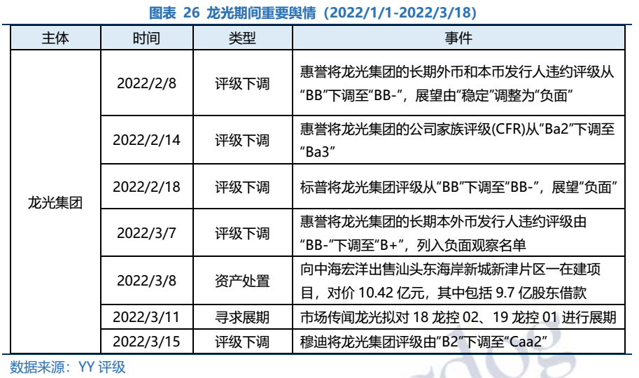 2022年1月1日至3月18日,YY評(píng)級(jí)綜合評(píng)估行業(yè)基本面、個(gè)體信用資質(zhì)及負(fù)面輿情等因素,下調(diào)42家地產(chǎn)主體評(píng)級(jí),即包括目前面臨流動(dòng)性或再融資困境的民營房企,也包括經(jīng)營能力較弱的央企/國企地產(chǎn)主體。
