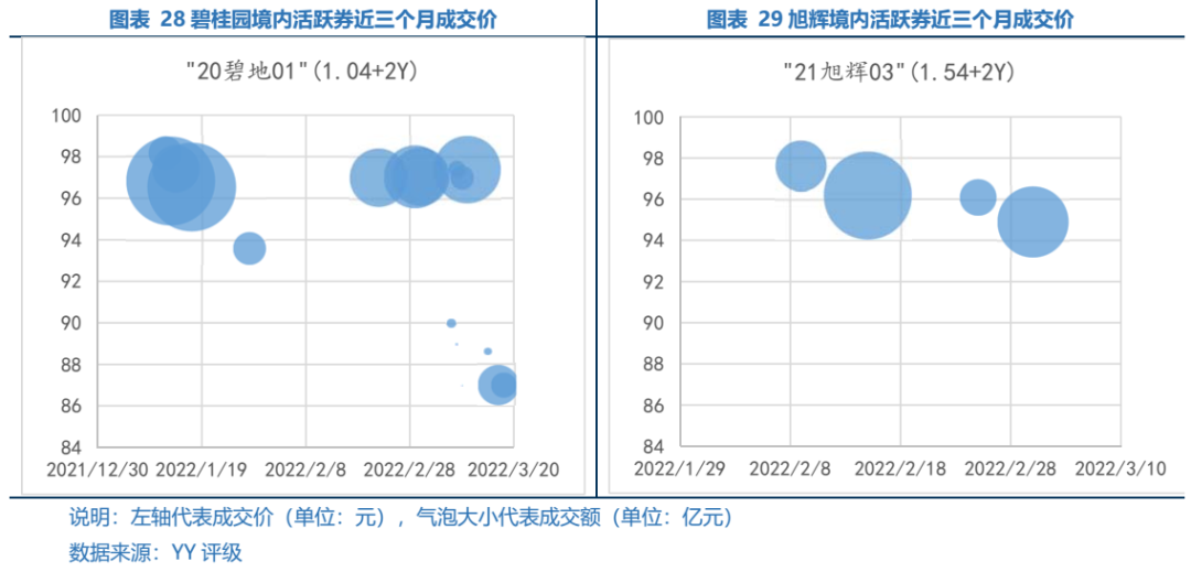 我們選取碧桂園、旭輝、融創(chuàng)和龍光期限相近的境內(nèi)債券,觀察2022/1/1-2022/3/18期間成交情況,不同資質(zhì)主體價(jià)格分層明顯。“21旭輝03”成交在94元以上;受龍光展期事件影響,“20碧地01”遭砸盤,價(jià)格由95元以上跌至87元。因債券展期消息,融創(chuàng)和龍光境內(nèi)債遭血洗,其中“20融創(chuàng)02”被大量拋售,價(jià)格跌至30元以下,“21龍控02”價(jià)格最低被砸至20元以下。