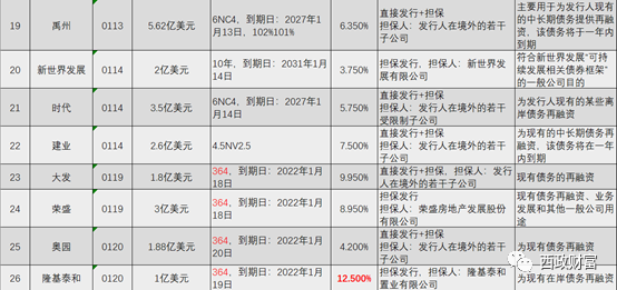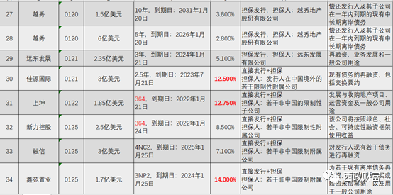 據我們不完全統計,2021年年初至今發行的70多支中資美元債中,以對現有債務再融資為目的的中長期債券相對居多;從發行票息來看,國央企(中國海外宏洋2.45%、華發3.6%、越秀3.8%)以及頭部房企及前30強房企(如碧桂園2.7%、世茂3.45%、旭輝4.375%、新城4.45%、龍光4.5%等)票息相對較低;上坤及隆基泰和由于首次發行境外美元債,此次發行的364天的美元債票息分別為12.75%及12.5%。除此之外,近期發行美元債的百強房企中,票息最高的為鑫苑置業的中長期美元債,票息為14%;另外,票息在10%以上的還有金輪天地(14.25%)、廣州方圓(13.6%)、佳源國際(12.5%)、陽光100中國(12%)、華南城(11.95%)、當代置業(11.95%)、富力(11.75%)、花樣年(11.625%)。從發行期限來看,發行期限以中長期為主。從發行架構來看,以RegS私募方式發行的債券規模仍居主導,直接發行+擔保為主要發行方式,另外,由于北大方正拒認提供維好協議的美元債券事件令維好協議風險再度聚焦,風險溢價上升,由此導致以維好架構發行的債券規模大幅下降。