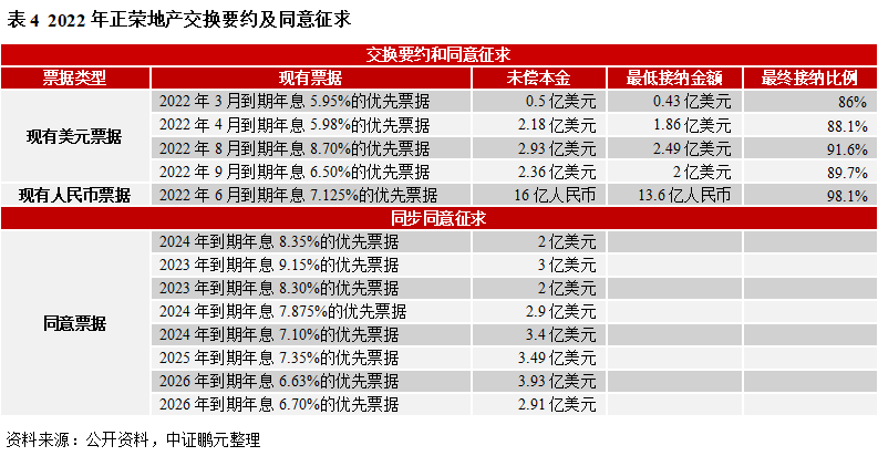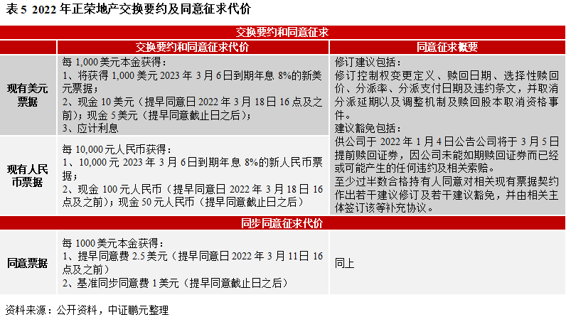 2022年房地產(chǎn)市場仍然面臨很大壓力,市場未出現(xiàn)大幅回升及多重融資選擇依然偏緊的情況下,正榮地產(chǎn)集團有限公司(簡稱“正榮地產(chǎn)”,6158HK)對其短期流動性仍持謹慎態(tài)度。公司預計其現(xiàn)有內(nèi)部資源可能不足以償還2022年3月到期境外債務,(1)于2022年2月21日對存續(xù)多只境外債券發(fā)起交換要約和同意征求,包括4只美元票據(jù)、1只人民幣票據(jù)(分別簡稱“現(xiàn)有美元票據(jù)”、“現(xiàn)有人民幣票據(jù)”,合并簡稱“現(xiàn)有票據(jù)”)。后經(jīng)多次修改,交換要約和同意征求期限變更為2022年3月4日-3月18日17點(倫敦時間,下同),提早同意截止日由3月4日延期至3月18日16點。(2)2022年2月21日-3月11日17點對8只美元票據(jù)(簡稱“同意票據(jù)”)進行同步同意征求,其中,提早同意日后續(xù)由3月4日延期至3月11日16點。根據(jù)公告,2022年3月28日召開持有人會議,審議上述特別議案,即同意征求涉及的修訂及豁免事項。3月29日,待特別決議通過,完成補充文件簽署,支付相關(guān)同意費用后,方可執(zhí)行相關(guān)修訂條款。