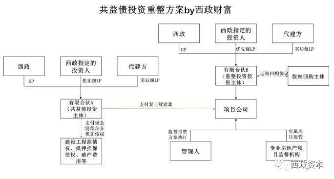 需要注意的是,以上投資架構的設置只能在項目公司股權可釋放出來的情況下才能適用(也即解除質押、查封并具備轉股條件),而事實上困境房企或破產房企項目公司的股權基本都無法滿足這一條件,因此我們在融資操作層面更多的是以共益?zhèn)鶛嗟耐顿Y為主,以下就我們目前的業(yè)務操作案例做簡要介紹和說明(具體見下述產品架構):