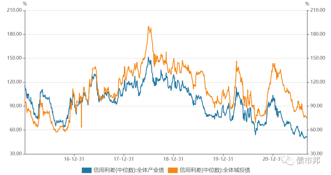 信用利差也在買買買的聲浪中被壓縮到極致,城投債利差來到了近年來的一個低點區(qū)域,產(chǎn)業(yè)債的利差更是打破了2016年資產(chǎn)荒時候的最低記錄。