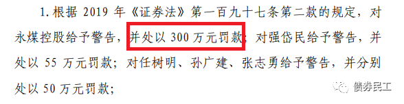 根據(jù)wind披露的公開信息,中國證監(jiān)會于2021年4月20日分別向華晨汽車集團控股有限公司和永城煤電控股集團有限公司下發(fā)了《行政處罰事先告知書》(處罰字[2021]24 號)、處罰字[2021]25 號)),分別給予兩家公司罰款5630萬元和300萬元!