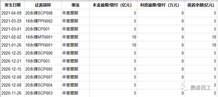 自2020年11月10日“20永煤SCP003”首次債券違約之后,永煤集團目前已經(jīng)對11只債券進行了展期,債券展期金額合計為65億元。永煤集團最新的主體信用評級為B(中誠信國際)。