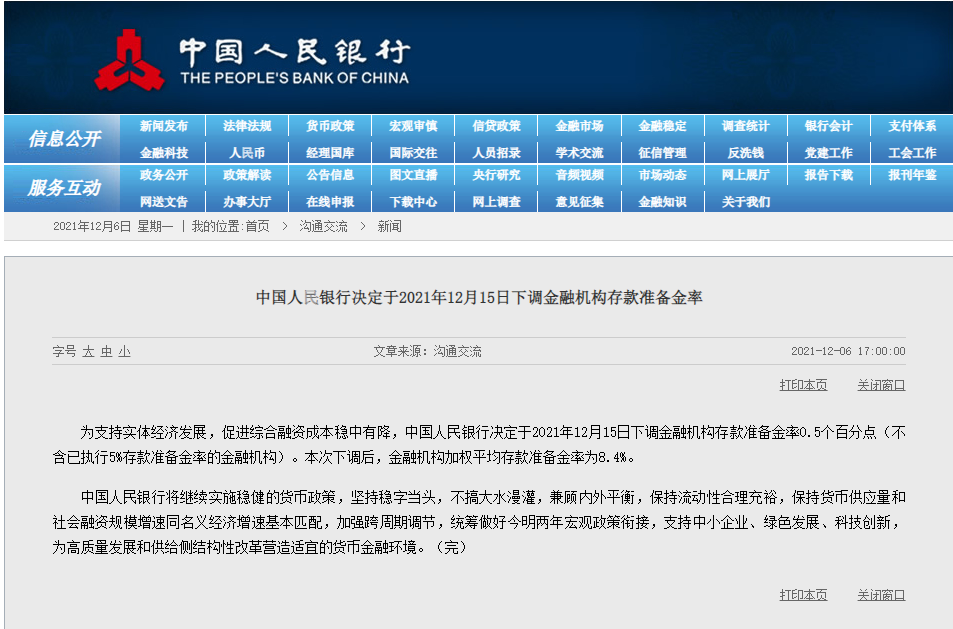 周一17:00:00,央行官網(wǎng)整點掛出了下調(diào)金融機構(gòu)存款準(zhǔn)備金率的新聞。