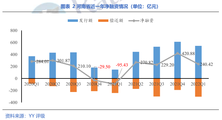 2022年一季度,全國城投債發(fā)行額13,728.97億元,償還額7,647.97億元,凈融資6,081.00億,其中河南省城投債發(fā)行額545.23億元,償還額304.81億元,凈融資240.42億元,占全國凈融資規(guī)模的3.9%,位居第十一。
