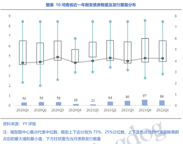 從發(fā)行情況來看,河南省近一年新發(fā)債券數(shù)量及發(fā)行票面利率如下圖所示,22年一季度月發(fā)行債券86只,發(fā)行額545.23億;整體看全省新發(fā)債券票面利率自21Q1以來波動上升,22Q1中位數(shù)為4.76%。