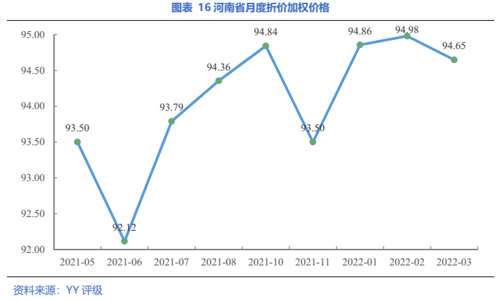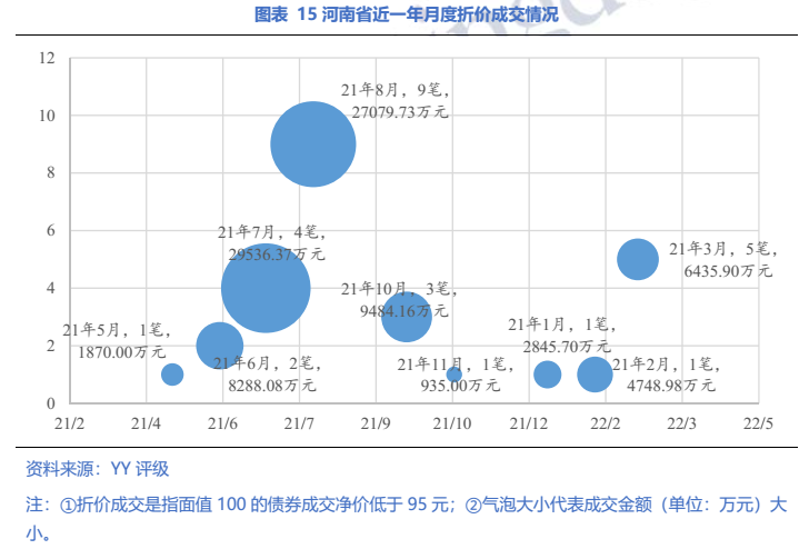 具體到主體,22年一季度河南省發(fā)生折價成交的平臺包括鄭州航空港興港投資集團有限公司(YY5-)和遂平縣開源投資有限公司(YY8),分別為鄭州市和駐馬店市的平臺。河南省近一年的折價成交主要發(fā)生在鄭州航空港興港投資集團中。