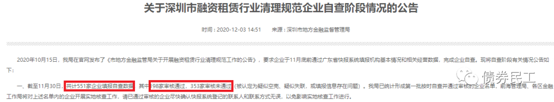 先來(lái)看一組數(shù)據(jù)。深圳市地方金融監(jiān)督管理局12月3日披露《關(guān)于深圳市融資租賃行業(yè)清理規(guī)范企業(yè)自查階段情況的公告》,公告中指出:截至11月30日,共計(jì)551家企業(yè)填報(bào)自查數(shù)據(jù),其中198家審核通過(guò),占比為35.93%;353家審核未通過(guò)(被認(rèn)定為疑似空殼、疑似失聯(lián),或填報(bào)信息存在問(wèn)題),占比約為64.07%。雖然融資租賃行空殼、失聯(lián)的現(xiàn)象一直都是比較嚴(yán)重,但是這次深圳官方統(tǒng)計(jì)的這個(gè)數(shù)據(jù),也在一定程度上反映了融資租賃行業(yè)的艱難。