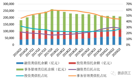 而如果是根據(jù)信托功能分類(lèi)看,2020年3季度的融資類(lèi)信托減少了4,966.43億元,信托的融資類(lèi)功能進(jìn)一步被削弱。