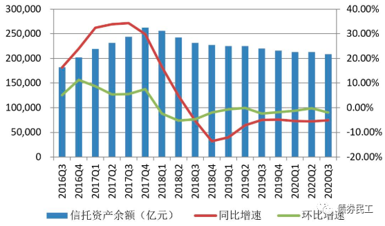 根據(jù)中國(guó)信托業(yè)協(xié)會(huì)的官方數(shù)據(jù),截至2020年3季度末,信托業(yè)受托管理的信托資產(chǎn)余額為20.86萬(wàn)億元,較年初減少7,432.79億元,同比下降5.16%;信托資產(chǎn)余額較2季度末減少4,182.31億元,環(huán)比下降1.97%。國(guó)內(nèi)的信托資產(chǎn)規(guī)模已經(jīng)是連續(xù)第11個(gè)季度下降。