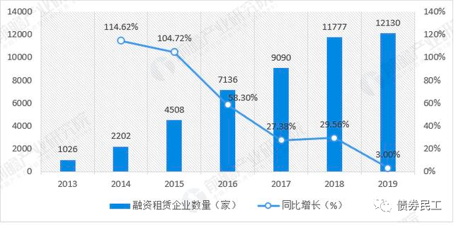根據(jù)租賃聯(lián)合研發(fā)中心會(huì)同中國(guó)租賃聯(lián)盟、天津?yàn)I海融資租賃研究院組織編寫(xiě)的《2019中國(guó)租賃業(yè)發(fā)展報(bào)告》,2019年中國(guó)融資租賃企業(yè)(不含單一項(xiàng)目公司、分公司、SPV公司、港澳臺(tái)當(dāng)?shù)刈赓U企業(yè)和收購(gòu)海外的企業(yè))總數(shù)約為 12130家,較上年增加了353家,增幅約為3%。從增幅數(shù)據(jù)可以看出,融資租賃行業(yè)的數(shù)量幾乎是呈現(xiàn)斷崖式下跌。而最新的截至2020年6月底,全國(guó)融資租賃企業(yè)總數(shù)約為12151家,較上年底增加了21家,增幅只有 0.17%。