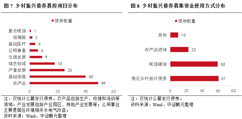 從融資主體看,鄉(xiāng)村振興涉及到的融資主體有地方政府、農(nóng)業(yè)龍頭企業(yè)、城投公司等。這里僅分析有債券融資空間的主體。第一,地方政府。鄉(xiāng)村振興和扶貧攻堅(jiān)一樣,以基層政府為主,尤其是欠發(fā)達(dá)地區(qū)。此類地區(qū)財(cái)政實(shí)力薄弱,債務(wù)融資以地方債和信貸資金為主。省市級(jí)政府可統(tǒng)籌區(qū)域內(nèi)鄉(xiāng)村振興發(fā)展,通過(guò)發(fā)行地方政府債券提供必要的資金支持、調(diào)劑域內(nèi)資金。第二,城投公司。對(duì)于園區(qū)、高標(biāo)準(zhǔn)農(nóng)田、特色小鎮(zhèn)等有收益的項(xiàng)目,各級(jí)城投可以充分利用市場(chǎng)化融資。但受限于地區(qū)債務(wù)率和企業(yè)自身債務(wù)情況,部分企業(yè)信用債融資受阻。對(duì)于公益性較強(qiáng),收益較弱的基礎(chǔ)設(shè)施,可以省、市級(jí)城投為融資主體,募集資金用于省市內(nèi)農(nóng)村建設(shè)、例如,道路、橋梁、基礎(chǔ)醫(yī)療和養(yǎng)老等。第三,農(nóng)業(yè)龍頭企業(yè)。2021年5月,央行等六部委聯(lián)合發(fā)布《關(guān)于金融支持新型農(nóng)業(yè)經(jīng)營(yíng)主體發(fā)展的意見(jiàn)》(銀發(fā)〔2021〕133號(hào))明確,拓寬新型農(nóng)業(yè)經(jīng)營(yíng)主體多元化融資渠道,支持優(yōu)質(zhì)農(nóng)業(yè)產(chǎn)業(yè)化龍頭企業(yè)發(fā)行非金融企業(yè)債務(wù)融資工具,募集資金可用于企業(yè)經(jīng)營(yíng)相關(guān)環(huán)節(jié)中參與的新型農(nóng)業(yè)經(jīng)營(yíng)主體的生產(chǎn)經(jīng)營(yíng)等。以農(nóng)業(yè)產(chǎn)業(yè)化百?gòu)?qiáng)企業(yè)為例,目前僅限于個(gè)別大型全產(chǎn)業(yè)鏈集團(tuán)型企業(yè)參與債券市場(chǎng),且不少企業(yè)的債券融資停留在2016年之前,募集資金主要用于集團(tuán)子公司向農(nóng)戶收購(gòu)生產(chǎn)原材料或補(bǔ)充流動(dòng)資金。第四,金融機(jī)構(gòu)。目前,尚未有金融機(jī)構(gòu)發(fā)行的鄉(xiāng)村振興債券,但隨著金融機(jī)構(gòu)支農(nóng)力度的加強(qiáng),或出現(xiàn)相關(guān)債券融資方式。