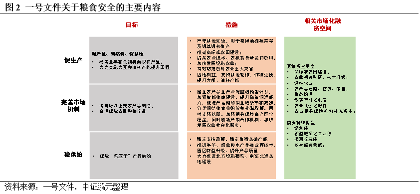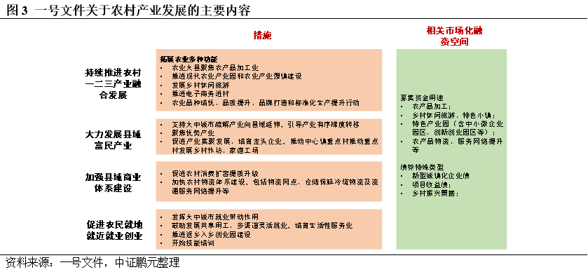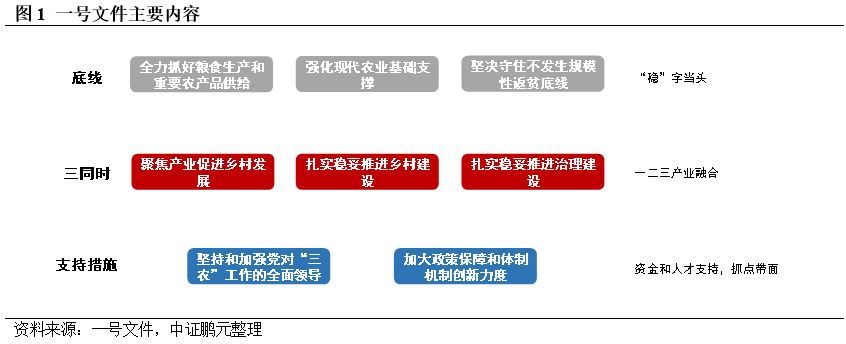 一號(hào)文件:一號(hào)文件指出,鄉(xiāng)村振興要守住保障國(guó)家糧食安全和不發(fā)生規(guī)模性返貧兩條底線,文件共分8個(gè)部分,其中,(1)第1-3章,主要說(shuō)明政策基調(diào)“穩(wěn)”字當(dāng)頭,包括全力抓好糧食生產(chǎn)和重要農(nóng)產(chǎn)品供給,強(qiáng)化現(xiàn)代農(nóng)業(yè)基礎(chǔ)支撐,堅(jiān)決守住不發(fā)生規(guī)模性返貧底。其中,“不發(fā)生規(guī)模性返貧”是扶貧攻堅(jiān)轉(zhuǎn)向鄉(xiāng)村振興的重要環(huán)節(jié),為鄉(xiāng)村振興工作構(gòu)建扎實(shí)基礎(chǔ)。(2)第4-6章,具體介紹了鄉(xiāng)村振興的三個(gè)領(lǐng)域,包括鄉(xiāng)村發(fā)展、鄉(xiāng)村建設(shè)和鄉(xiāng)村治理,其核心為“促進(jìn)一二三產(chǎn)業(yè)融合”,以二三產(chǎn)業(yè)促進(jìn)農(nóng)業(yè)實(shí)現(xiàn)轉(zhuǎn)型升級(jí),同時(shí)形成產(chǎn)業(yè)效應(yīng),發(fā)展經(jīng)濟(jì)、帶動(dòng)就業(yè),同時(shí)推進(jìn)鄉(xiāng)村基礎(chǔ)設(shè)施改造升級(jí),推進(jìn)數(shù)字鄉(xiāng)村、綠色鄉(xiāng)村、和諧鄉(xiāng)村的建設(shè)。(3)第7-8章,明確政策支持措施,包括擴(kuò)大鄉(xiāng)村振興財(cái)政資金投入、強(qiáng)化鄉(xiāng)村振興金融服務(wù)和人才隊(duì)伍建設(shè),以及積極推動(dòng)農(nóng)村經(jīng)濟(jì)發(fā)展新模式的探索。