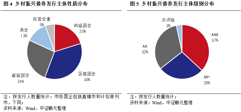 從發(fā)行主體性質(zhì)看,鄉(xiāng)村振興債券參與者主要是國(guó)有企業(yè),其中,區(qū)縣國(guó)企占比36%,為主要發(fā)行人類型,其次是省級(jí)國(guó)企,占比26%,市級(jí)國(guó)企占比20%。從發(fā)行主體級(jí)別看,AAA級(jí)占比37%,以省級(jí)國(guó)企和央企為主;AA級(jí)占比32%,以區(qū)縣國(guó)企為主;AA+級(jí)占比28%,以市級(jí)和區(qū)縣國(guó)企為主。