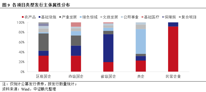 結(jié)合企業(yè)屬性來(lái)看:第一,區(qū)縣國(guó)企。主要承擔(dān)產(chǎn)業(yè)園區(qū)建設(shè)、農(nóng)貿(mào)市場(chǎng)以及公用事業(yè)項(xiàng)目。此類項(xiàng)目,建設(shè)難度相對(duì)較低,但對(duì)運(yùn)營(yíng)的要求較高,需要關(guān)注運(yùn)營(yíng)期的預(yù)期收入情況。第二,市級(jí)國(guó)企。主要承接農(nóng)產(chǎn)品收儲(chǔ),其次,是公路建設(shè)和產(chǎn)業(yè)園區(qū),其中公路建設(shè)以償還相關(guān)債務(wù)為主。第三,省級(jí)國(guó)企。主要負(fù)責(zé)高速公路建設(shè),其次是農(nóng)產(chǎn)品收儲(chǔ)。第四,央企。主要承接綠色領(lǐng)域項(xiàng)目,主要包括太陽(yáng)能、風(fēng)力發(fā)電等新能源項(xiàng)目,其次是農(nóng)產(chǎn)品收儲(chǔ)、流通,主要是農(nóng)業(yè)產(chǎn)業(yè)化龍頭企業(yè),例如,中糧集團(tuán)、蒙牛等。第五,民營(yíng)企業(yè),主要是農(nóng)業(yè)產(chǎn)業(yè)化龍頭企業(yè),例如,新希望、金龍魚、伊利,以及德邦,募集資金用于農(nóng)產(chǎn)品收購(gòu)和物流建設(shè)。