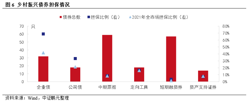 鄉(xiāng)村振興債券發(fā)行情況:截至2022年2月,鄉(xiāng)村振興債券共發(fā)行198只,融資規(guī)模約1,427億元,涉及149家發(fā)行主體。其中,鄉(xiāng)村振興債務(wù)融資工具和專項(xiàng)公司債規(guī)模合計(jì)占比85%,是主要品種。第一,鄉(xiāng)村振興債券參與者主要是國(guó)有企業(yè),其中,區(qū)縣國(guó)企占比36%,為主要發(fā)行人類型。第二,AAA級(jí)占比37%,以省級(jí)國(guó)企和央企為主;AA級(jí)占比32%,以區(qū)縣國(guó)企為主;AA+級(jí)占比28%,以市級(jí)和區(qū)縣國(guó)企為主。第三,擔(dān)保比例19.7%,企業(yè)債和公司債的擔(dān)保比例明顯高于市場(chǎng)平均水平。第四,募集資金主要用于農(nóng)產(chǎn)品生產(chǎn)、收儲(chǔ)、流通等方面,其次是道路建設(shè)。從使用方式看,有40%的項(xiàng)目是用于償還相關(guān)項(xiàng)目借款,39%用于項(xiàng)目建設(shè),15%用于農(nóng)產(chǎn)品收儲(chǔ)。第五,不同類型企業(yè)承擔(dān)不同項(xiàng)目。區(qū)縣國(guó)企主要承擔(dān)產(chǎn)業(yè)園區(qū)建設(shè)、農(nóng)貿(mào)市場(chǎng)以及公用事業(yè)項(xiàng)目;市級(jí)國(guó)企主要承接農(nóng)產(chǎn)品收儲(chǔ);省級(jí)國(guó)企主要負(fù)責(zé)高速公路建設(shè),央企主要承接綠色領(lǐng)域項(xiàng)目,主要包括太陽(yáng)能、風(fēng)力發(fā)電等新能源項(xiàng)目;民營(yíng)企業(yè),募集資金主要用于農(nóng)產(chǎn)品收購(gòu)和物流建設(shè)。