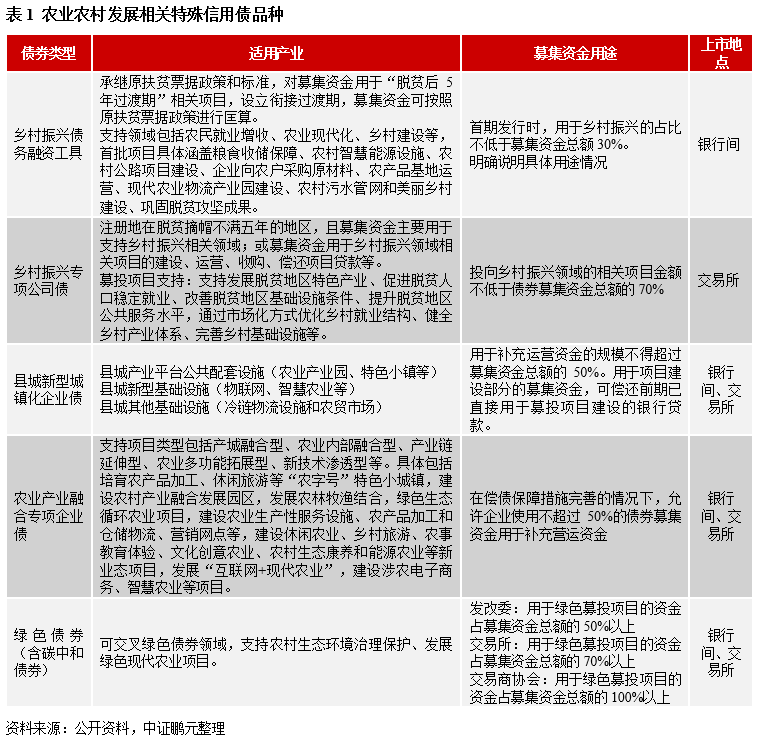 一號(hào)文件明確,擴(kuò)大鄉(xiāng)村振興投入,繼續(xù)把農(nóng)業(yè)農(nóng)村作為一般公共預(yù)算優(yōu)先保障領(lǐng)域。除財(cái)政和信貸資金支持外,結(jié)合現(xiàn)有鄉(xiāng)村振興政策,債券融資可以從以下領(lǐng)域入手:第一,募集資金用途可以用于高標(biāo)準(zhǔn)農(nóng)田建設(shè)、農(nóng)業(yè)相關(guān)科研,技術(shù)升級(jí),設(shè)施農(nóng)業(yè),農(nóng)產(chǎn)品倉(cāng)儲(chǔ)、物流、銷售,生態(tài)治理以及農(nóng)業(yè)相關(guān)保險(xiǎn)機(jī)構(gòu)補(bǔ)充資本。第二,從債券類型看,可以采用綠色債、新型城鎮(zhèn)化企業(yè)債、項(xiàng)目收益?zhèn)⑧l(xiāng)村振興票據(jù)等。