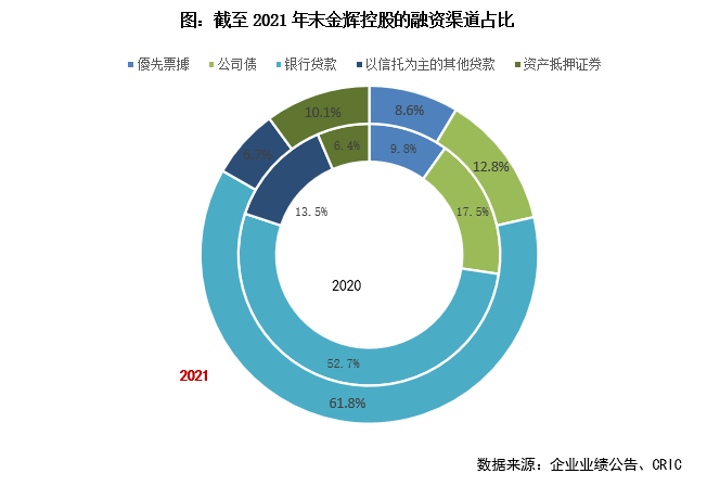 信用風險減少和融資渠道通暢,一定程度反映在金輝2021年新發行的債券上。全年金輝于公開市場融資活躍,上半年成功發行2021年第一期小公募和第一期供應鏈ABN ,7-8月成功發行2021年第二期小公募、第二期供應鏈ABN以及CMBS,9月發行一筆CMBS以及境外優先票據,融資渠道逐漸拓展。年內金輝加權平均融資成本6.58%,較去年同期的7.47%改善顯著。截至2021年末,三大國際評級機構均維持金輝控股長期發行人主體評級不變,標普給予B+/穩定,穆迪B1/穩定,惠譽B+/穩定。