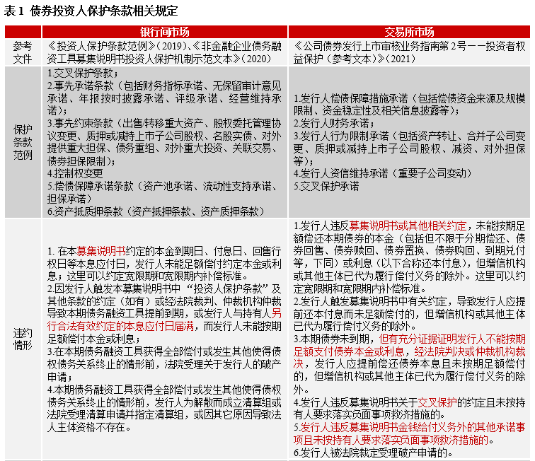 從2022年違約地產債券后續處置看,保護性條款對企業償付壓力和債券兌付的影響較為明顯。投資人保護性條款是為保護投資人相關權益而在發行文件中明確做出相關約定,為債券糾紛提供處置依據。在我國,2016年9月,銀行間市場首先推出《投資人保護條款范例》(簡稱《范例》),并在2019年進行修訂,新設事先承諾條款、償債保障承諾條款、資產抵質押條款,將事先約束條款中部分指標進行重新分配,增加多項參考性細分條款。2020年10月,交易商協會又發布《非金融企業債務融資工具募集說明書投資人保護機制示范文本》,進一步完善保護條款應用機制。2017年6月,交易所市場由中證協發布《公司債券投資者保護條款范例(征求意見稿)》,后續并未出臺正式稿。2021年8月,滬深交易所發布《公司債券發行上市審核業務指南第2號——投資者權益保護(參考文本)》(簡稱《參考文本》),進而彌補了交易所市場在此領域的政策空白。從違約觸發事件的參考定義看,二者都包括未能履行既有約定的償付義務,因償債能力不足導致進入破產相關程序,以及主張預期違約下經法院或仲裁機構判決提前到期而未足額償付的情形。此外,交易所還包括“未按持有人要求落實負面事項救濟措施的”的情形,進一步擴大了違約范圍,同時強化保護性條款救濟措施的約束力。