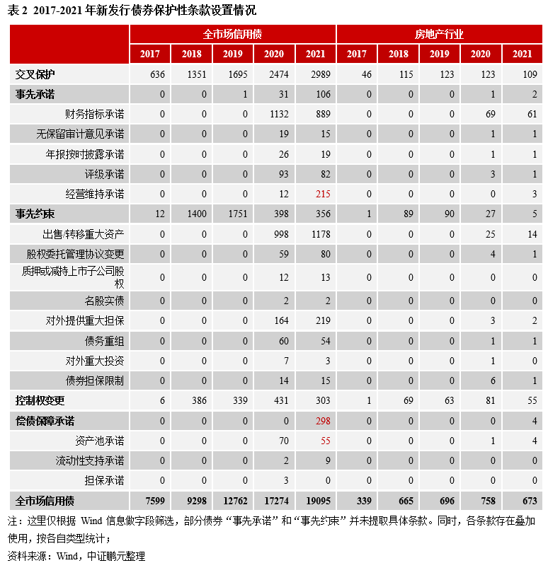 國內保護性條款發展情況:(1)發展概況:2016年銀行間市場首先推出《投資人保護條款范例》,并在2019年進行修訂。2017年交易所市場由中證協發布《公司債券投資者保護條款范例(征求意見稿)》,并在2021年8月由滬深交易所發布《公司債券發行上市審核業務指南第2號——投資者權益保護(參考文本)》。保護性條款旨在約束發行人日常經營行為,提高負債管理主動性,從而降低償債風險,保護持有人利益,同時,作為風險暴露時的重要處置依據。兩個市場在保護性條款方面的制度有一定的差異。銀行間市場對保護性條款的相關示范較為細致,且因出臺較早,2020年之前市場上已發行債券均參照銀行間相關規定。(2)保護性條款應用情況:第一,保護性條款應用和條款類型大幅提升。含持有人保護性條款的債券占比從2017年8.4%上升至2021年的21.8%,其中交叉保護條款應用最廣。第二,不同保護性條款可以疊加使用。第三,從市場分布看,含保護性條款的債券主要分布在銀行間市場但隨著交易所制度的完善,其債券應用比例有明顯上升,2021年為25%。具體看房地產行業,有保護性條款債券占地產行業債券的比例從2017年的13.6%增長到2021年的22%,以交叉保護條款為主,2021年AAA級主體發行的債券中約49%含保護性條款。(3)保護性條款觸發情況:截至2022年3月,已經出現債券違約的企業有198家,違約債券319只,其中涉及保護性條款的債券有69只,占比約21.6%。其中,房地產企業共計29家,違約債券125只,其中涉及違反保護性條款的有25只 ,涉及8家主體,在所有觸發保護性條款的樣本中占比均為32%,位列第一大行業。