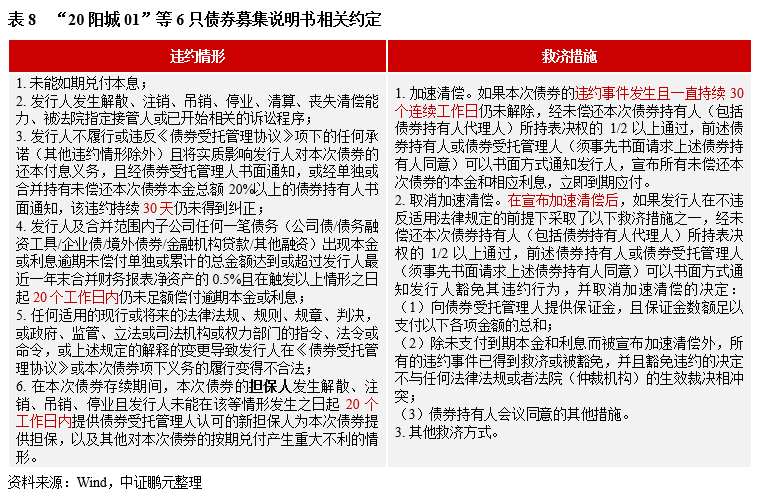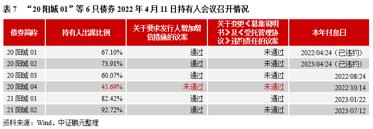 受企業償債風險顯露影響,不包含保護性條款的債券觸發持有人會議召開條件。例如,2022年4月11日,“20陽城01”、“20陽城02”、“20陽城03”、“20陽城04”、“21陽城01”、“21陽城01”、“21陽城02”由債券受托管理人作為會議召集人召開持有人會議,審議的議案中包括增加增信措施,變更《募集說明書》及《受托管理協議》違約責任等。截至表決日中,僅“21陽城01”通過變更違約責任的議案,為此,其他債券均觸發約定的違約情形,其中,“20陽城04”因未達出席比例,根據約定該次持有人會議無效。
