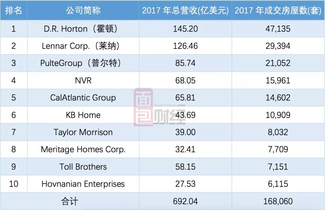 根據(jù)美國Builder雜志每年對(duì)全美房地產(chǎn)開發(fā)商的排行,我們可以看到美國開發(fā)商的營收和房屋成交情況,下表為2018年的TOP10: