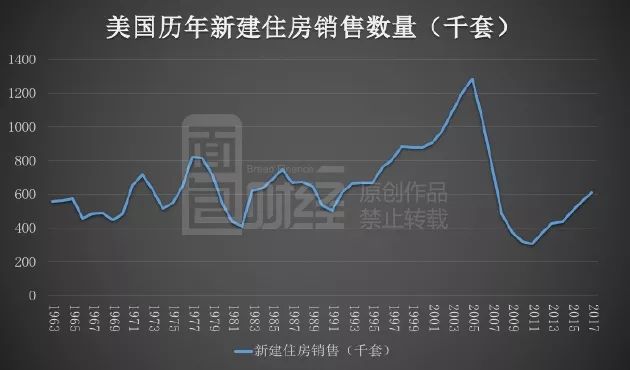 可以說,二戰(zhàn)后直至1970年代初,美國房地產(chǎn)行業(yè)的繁榮本質(zhì)上是由城市化進(jìn)程推動(dòng)的。來看一下美國歷年新建住房銷售數(shù)量的情況: