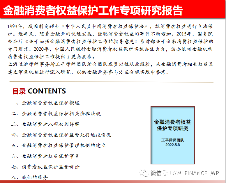 上海蘭迪律師事務所王平律師團隊結合團隊成員以往從業經驗,從金融消費者相關權益及建立審查機制進行深入研究,以供金融業務參與方在合規實踐中參考。