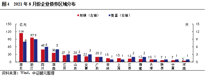 2021年8月,共有16個省份發(fā)行了企業(yè)債券。其中,湖北省和浙江省分別發(fā)行114.30億元和96.50億元,規(guī)模遠(yuǎn)高于其他省份,其次,四川省和湖南省分別發(fā)行49.40億元和36.20億元。從發(fā)行數(shù)量上看,浙江省和湖北省分別發(fā)行9只和8只,四川省和湖南省分別發(fā)行6只和5只,其他省份發(fā)行數(shù)量較少。與上年同期相比,8月分,有8個省份發(fā)行規(guī)模較上年同期出現(xiàn)增長,其中,浙江省同比增長311%;有6個省份發(fā)行規(guī)模同比出現(xiàn)下降,其中廣東省下降71%,而云南、重慶、甘肅和河北本月未發(fā)行。